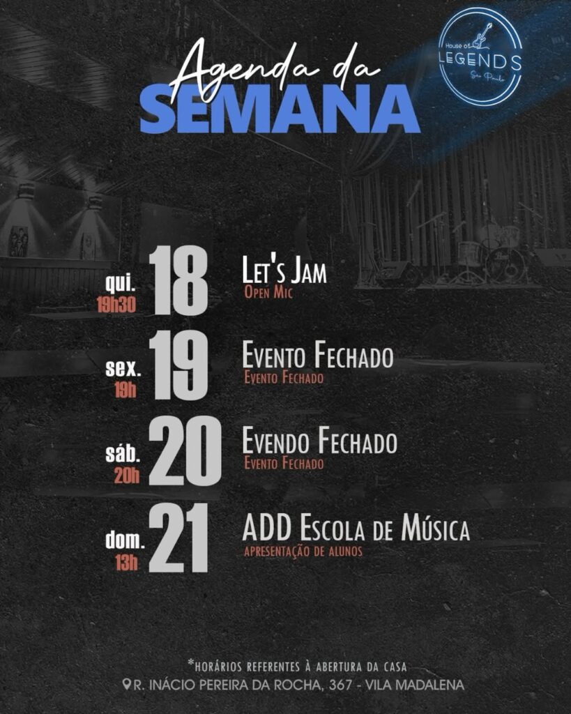House of Legends é um bar e balada com DJ’s, música ao vivo e shows de stand up comedy localizado no coração da Vila Madalena. Rock, Pop Rock, Heavy Metal, Blues, Jazz, R&B, seja qual for o seu estilo teremos uma noite com sua música favorita tocando.